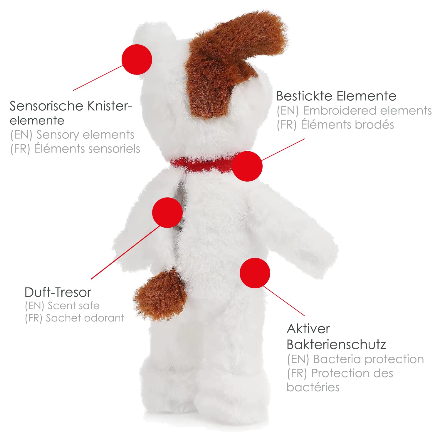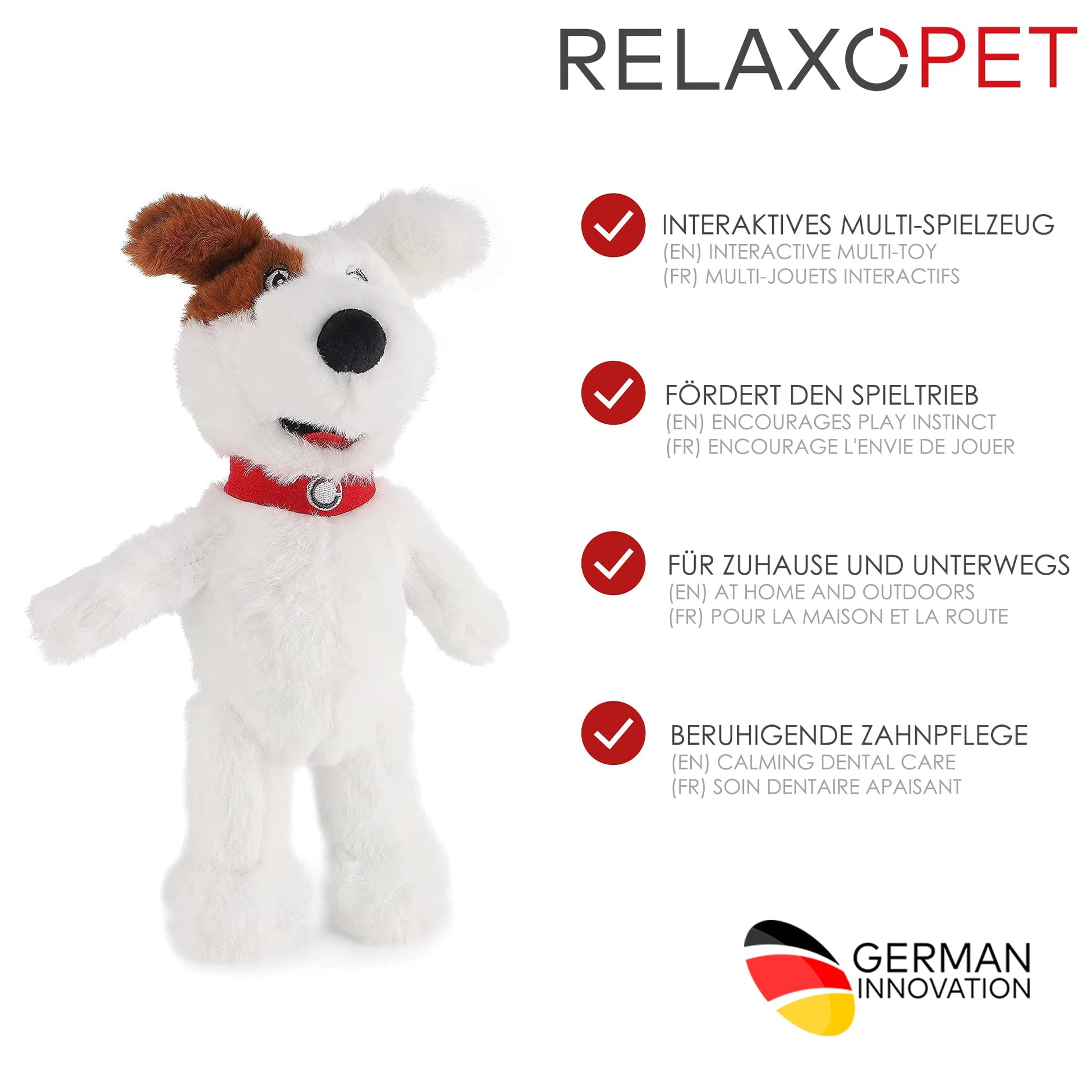 Im RelaxoPet MULTI-BUDDY befinden sich drei sensorische Knisterelemente, die dem Hund einen zusätzlichen Anreiz und Spielfreude bieten.